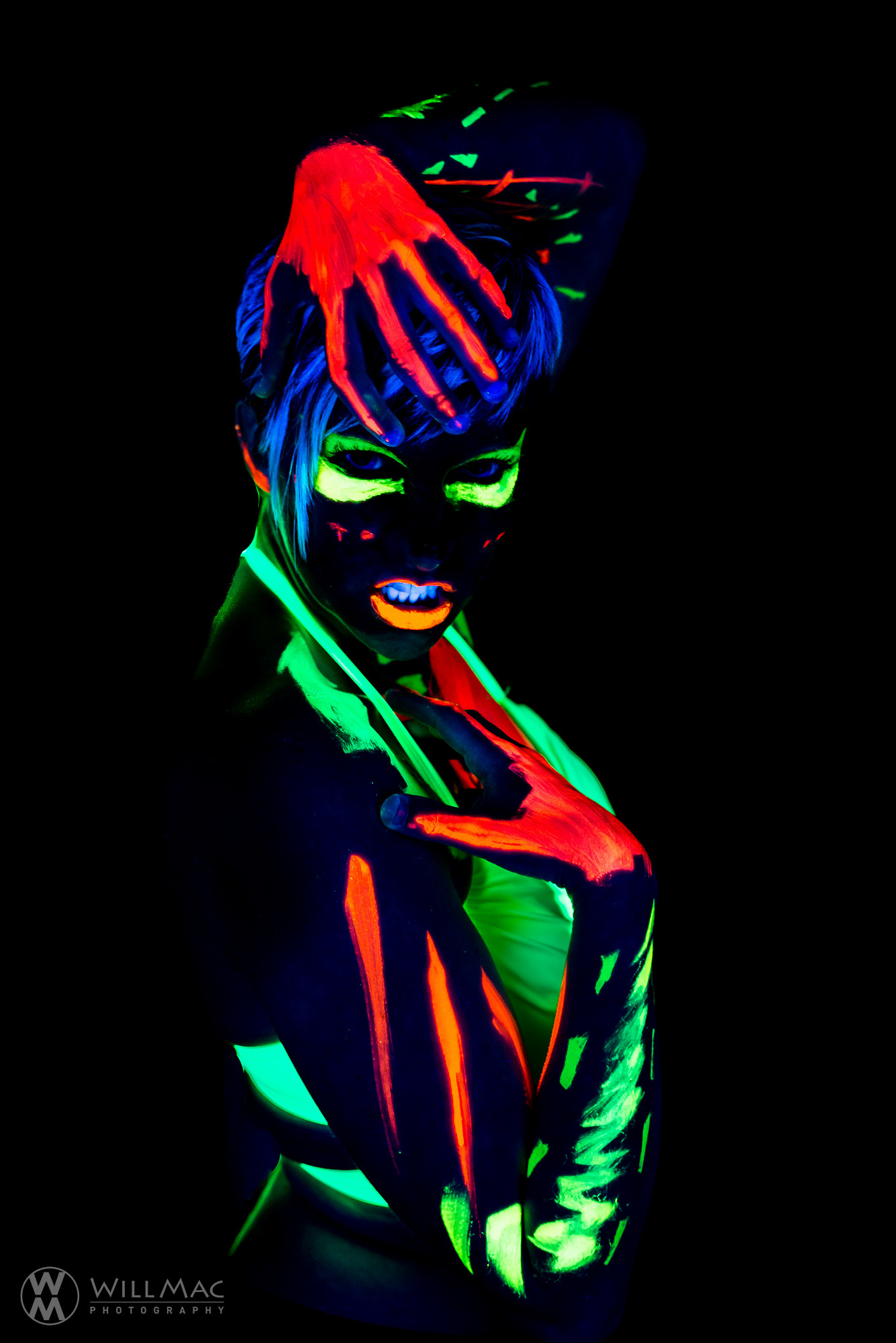 This project was completed in an effort to branch into photobashing and was my first design concept using the technique. The character is composed entirely of segments taken from the second image of the model wearing UV paint which were warped and edited to form the various components.